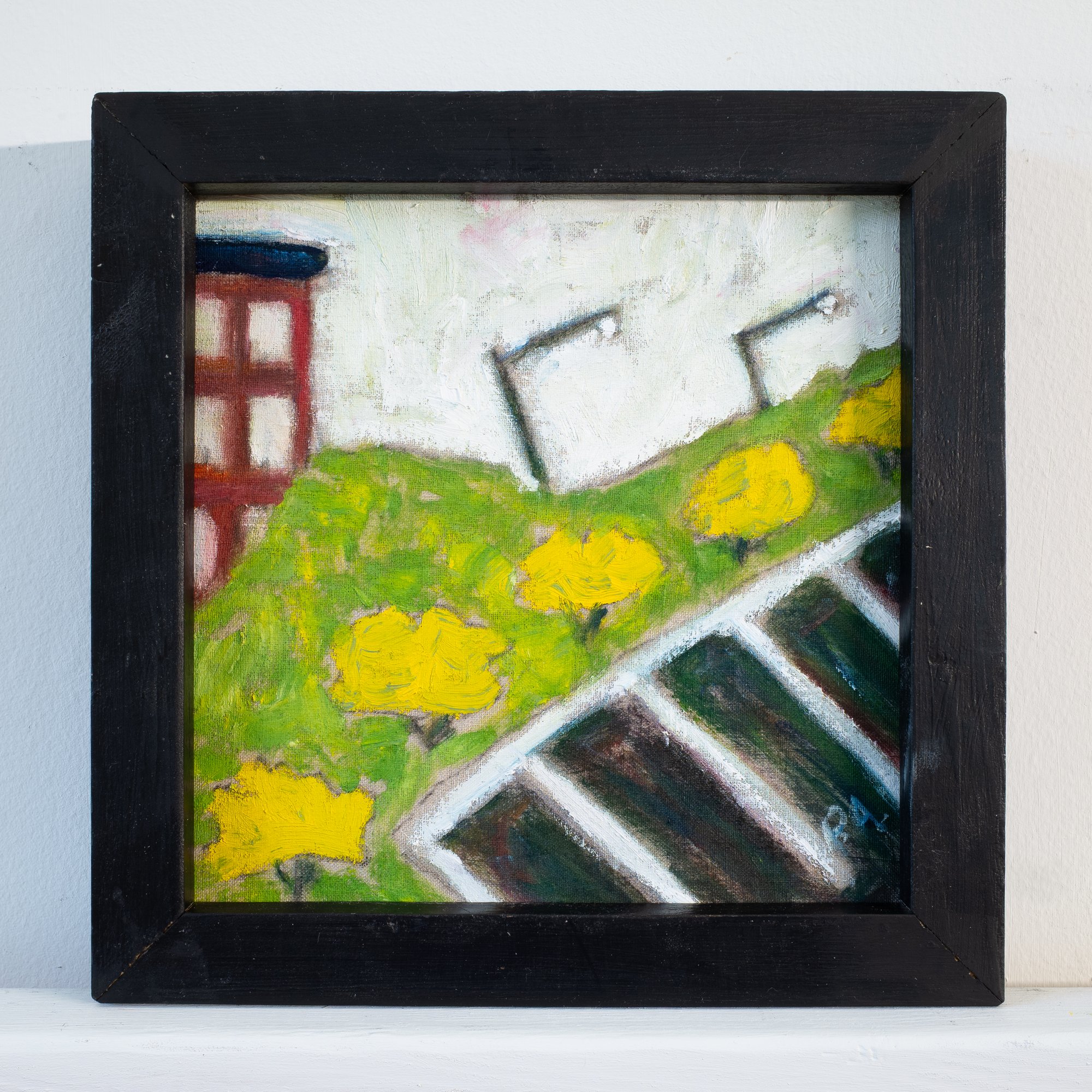 Parking Lot with Yellow Shrubs, 2025, 10x10 inches framed, oil on linen.